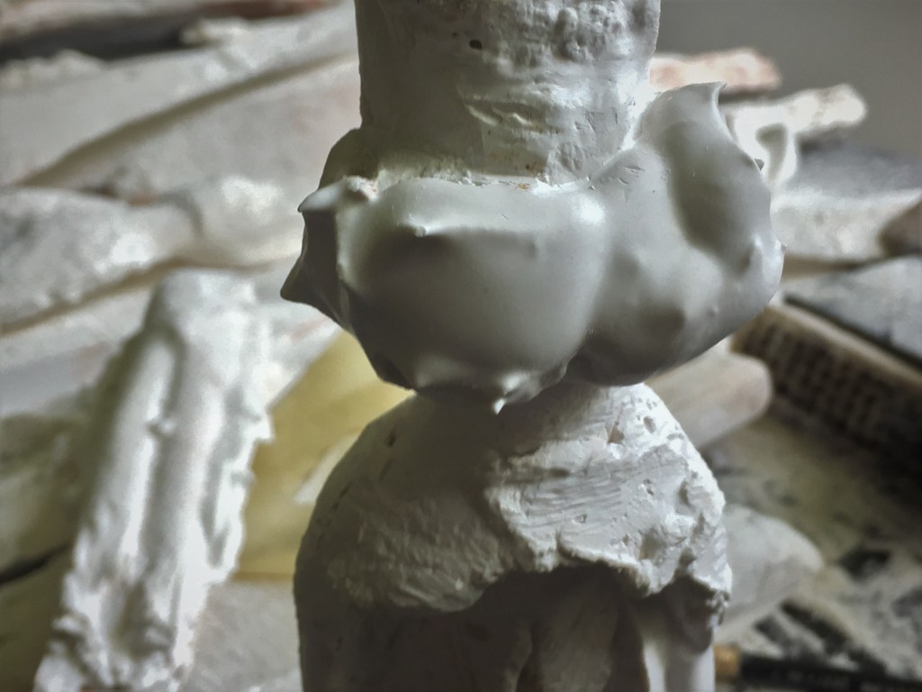 And I have a doll. The poet Cynthia Nadelman, granddaughter of the artist, gave it to me (neither of us ever met him). Untitled, unsigned, undated, a plaster casting 9 1/16” high, with subsequent additions in plaster (left foot extended) some breakage (tip of right hand) and considerable carving with knife, rasp and sandpaper. By whittling the casting, the artist turned her head from face-front to looking over her right shoulder. He penciled in the new neckline of her bodice, bangs falling out from under her hat, and a new mouth and eyes. I witness that work as if it were happening before me. As if I saw her open those eyes.