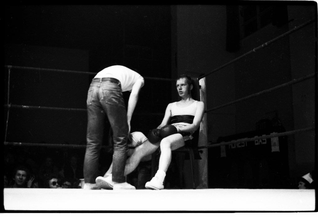 ‘Deacon to nail one more’, photo from the infamous Boxing Contest organised by students in the Locked Room, Richard Deacon in corner, Nov 1971, photo courtesy Tom McPhillips