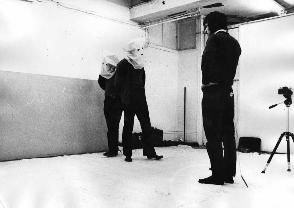 During the Mask Project, The Locked Room, St Martins School of Art, 1972, Garth Evans and Peter Kardia in masks, David Millidge in front. Photo Courtesy David Millidge